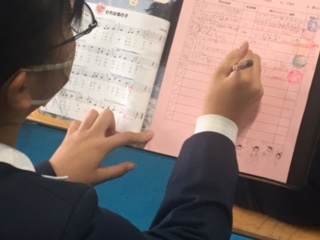 6年生、音楽の時間です。まずは自分の良い声が出るように、体ほぐしからスタート。そこから歌やリコーダーへと授業が進んでいきます。「いいですね。だいぶ声が出てきましたよ」「強弱を意識できていて素晴らしい」「リコーダーの練習頑張ってきたんですね。成果が出ていますよ」曲の後でも途中でも、褒めてもらって、子どもたちはまたひとつレベルアップさせていました。たずねてみると、毎時間ごとにめあてを書いたり振り返ったりするピンク色の「ふりかえりカード」への、先生からのひとことメッセージも、子どもたちの励みになっているようです。