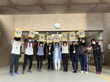 ふと見上げると教頭先生が手を振ってくれています。また先生方も「いってらっしゃい」の手づくりプラカードでお見送り。バス車内でも歓声があがっていました。