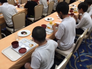 子どもたちに聞いてみると、かぼちゃのスープ、チキンのトマト煮、やきそば、ハンバーグ、パイナップル、デザートのケーキ!などなど、人気が高かったようです。みんな美味しくいただきました。