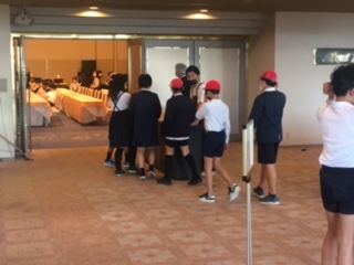 部屋の片付けが済んだ班から、チェックを受けて集合です。友だちと協力して、時間に間に合うようにテキパキ行動できましたね。