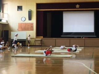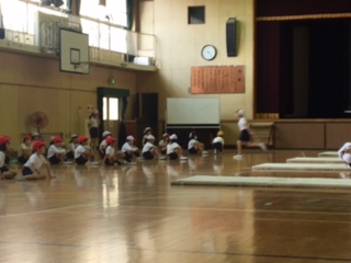 体育館では、2年生が体育をしていました。マットを使って運動遊び。まずはチャレンジ。最後まで進んだら、サッと元の場所にもどっていきます。