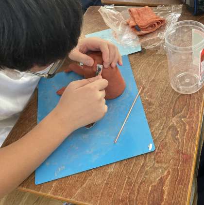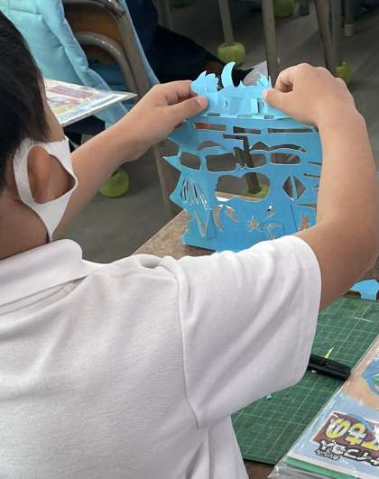 ある教室では、色画用紙を自分の思う形に切り、手に持ちながら「この方がいいかな?」と考えながら構図を考えている姿。また別の教室では、粘土を優しく支え、へらで形を慎重に整えながら作品をつくる姿。今、育和小学校では「作品展」に向けて、どの学年の子どもたちも一生懸命に取り組んでいます。
