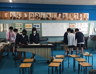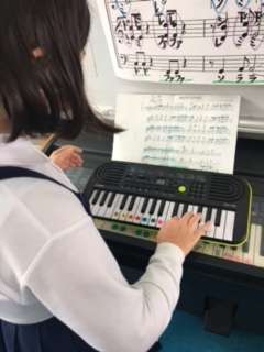 そんななか、音楽室から楽器の音が聞こえてきました。キーボードの譜面を見ながら一音一音確認して、「ふ〜ぅ、最後までいけた」と一言。また、2人組の子たちは、メヌエットの曲に「ここは、こうやからさぁ」とリコーダーの指の運びを教え合ったり。奥の方では、みんなで合わせる合奏の機会に向けて、木琴や大だいこ、小だいこ、とそれぞれパート別に練習に励んでいました。