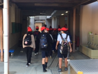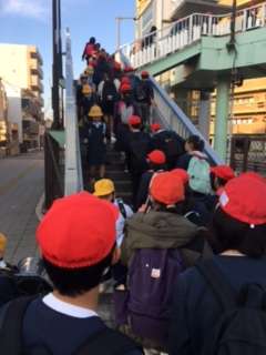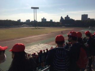 今日6年生は、スポーツ交歓会で長居競技場に向かって出発しました。少し早めの出発だったので、駅に向かう途中で、登校して来た1〜5年生とすれ違いました。「あ、6年生のお兄ちゃんや!」「どこ行くの?行ってらっしゃ〜い」「行って来まーす!」ニコニコと手を振り合っていました。