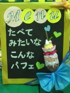 さあ、どんなパフェが並んでいるのでしょう。講堂右側、一番奥です。