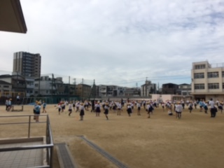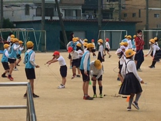 育リンピックの様子です。運動委員会の子どもたちが、前でお手本をしたり、下の学年の子にやさしく教えてあげたり。なわとびを通じて異学年の子どもたちとの交流タイムです。