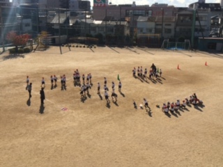 渡り廊下から見下ろすと、運動場では1年生が体育の授業で、ボールを使った運動に取り組んでいました。いったん集まって説明を聞いたり、また広がっては、楽しそうにとびまわったり。外は寒くとも、太陽の光を浴びながら、子どもたちは元気です。