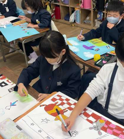 図画工作の学習です。画用紙を手に「たくさん雪が降ってるねん。」「ここにおじいさんが来てな…」と頭の中で描いているおはなしを目を輝かせて笑顔で一生懸命に伝えてくれる1年生。伝えながら、「あっ!いいこと考えた!!」と、さらにイメージが膨らみ、パスを手にとり描き進めていました。中には、紙を形に切り、貼り合わせて表現したり、塗り方を工夫したりと子どもたちの発想の展開が広がっていきます。一枚の絵の中に一人一人のお話がたくさん詰まっています。