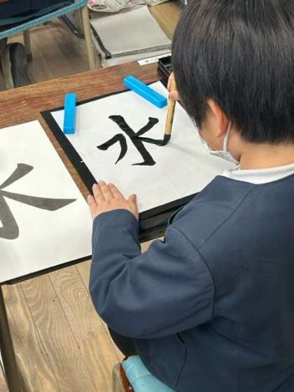 「水」は、バランスをとるのがなかなか難しい文字です。とめ、はね、はらい、全てが入っています。それでも、子どもたちの集中力はたいしたものです。書写の時間に一生懸命取り組む、3年生でした。