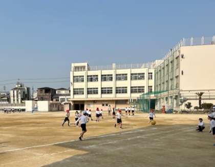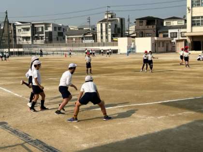 3年生がチームに分かれてキックベースボールをしていました。対戦してはいるのですが、子どもたちは優しいもので、ボールが真っ直ぐ投げられなかったときは「ごめんごめん、今のはやり直しね」「いいで、いいで〜。だいじょうぶ。もう1回ね」と声をかけ合っています。