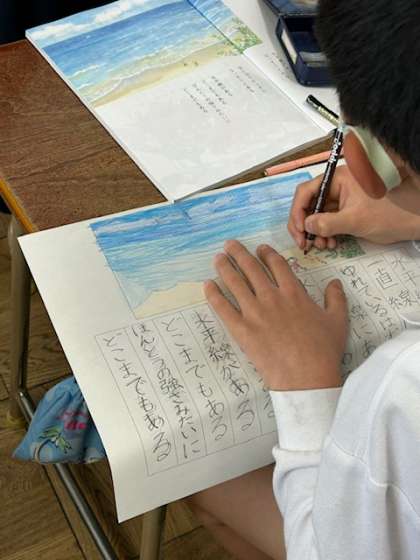 国語の時間です。扉の詩「水平線」を学習していました。