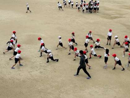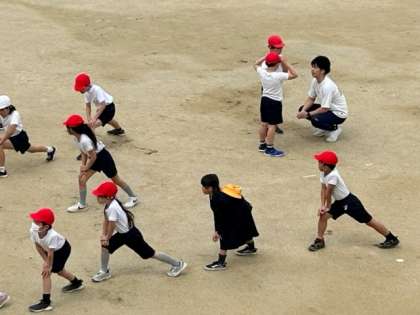 「1(いち)2(に)3(さ〜ん)4(し)!」と元気なかけ声が聞こえてきます。2年生の子どもたちが、体育の時間に準備体操をしていました。体育係と思われる子どもたちが前に出て、クラスのみんなをリードしています。周りの子たちも「5(ごー)6(ろく)7(しち)8(はち)!」1年生のときの経験を活かして、がんばっています。