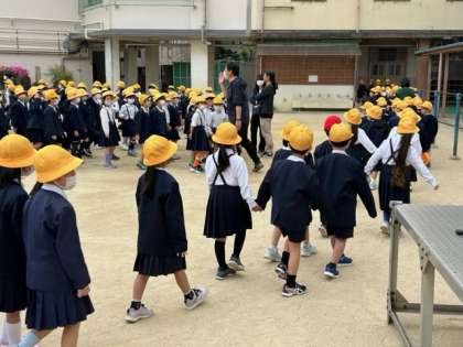 お話や連絡が終わると行進曲が流れ、その音楽に合わせて子どもたちはクラスごとに順に教室へと進んでいきます。1年生も、担任の先生を先頭に、前回習った順番で並んで帰っていきました。