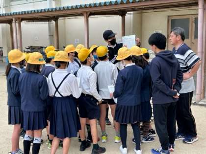 その後、今日は美化委員会の子どもたちが、鉄棒前に集まって説明を聞いています。学校全体のために、委員会のお仕事もがんばってくださいね。
