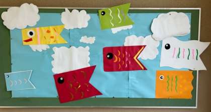 今日から5月です。育和小学校では、掲示委員会の子どもたちが、ひと足早く、鯉のぼりをつくってくれていました。「屋根より高い〜」で始まる童謡「こいのぼり」は、今から90年以上前に、「ニホンショウカ ハルノマキ」で初めて紹介されたそうです。この掲示物を見ると、思わず心のなかでメロディーが流れますね。