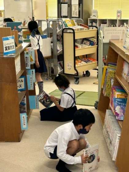 誰もいないのかな、と思えるくらい静かな図書室。次はどんな本を読もうかな・・・と探し中です。その場に座り込んで読んでいる姿も。これからいろんな本と出会ってくださいね。