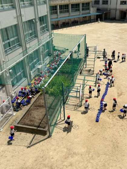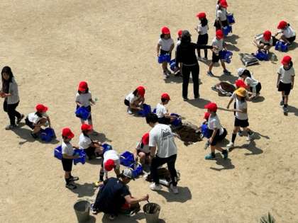 2年生が苗植えをしています。これから育てるのは一口トマト。植木鉢に土を入れて、お水もたっぷりあげて・・・。今日は気温も上がるなか、みんなでせっせと活動していました。