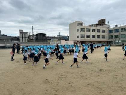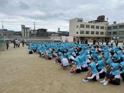 20日(土)に、防災訓練・体験学習を全校一斉に実施しました。教室指導のあと、まずは避難訓練。校内緊急放送のあと、子どもたちが運動場に集まってきました。いつもの様子とは、打って変わって真剣な表情です。講話のあと、次は津波や水災害を想定して、校舎上層階へと移動しました。