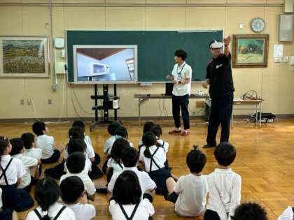 ほかにも、地震の際の対応について、みんなで学ぶVR体験(今回初登場!)がありました。代表でゴーグルを付けた担任の先生が見ている画像を、クラスみんなで、全体画面を見ながら共有します。「あぶない」「こっちこっち!」と子どもたちは先生に声援を送りました。
