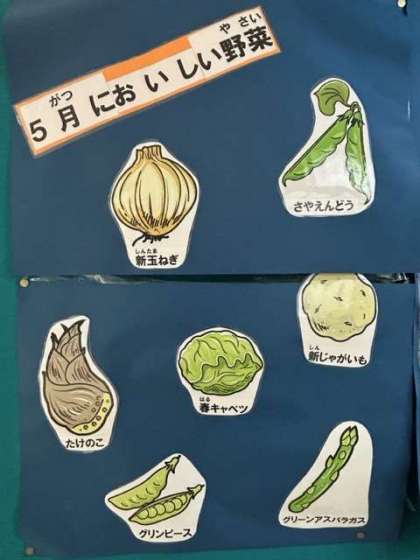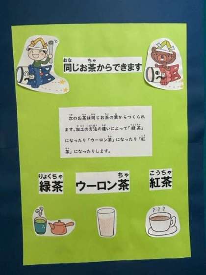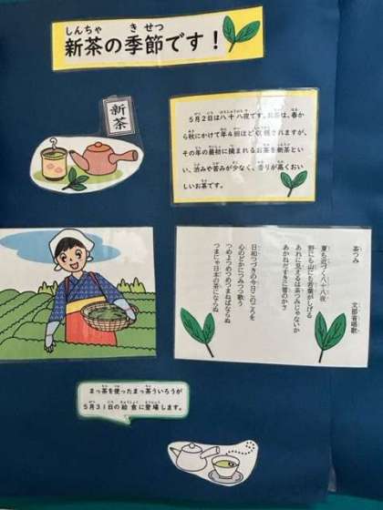 栄養教諭の先生が、毎月、季節に合わせていろんな情報を掲示板で紹介してくれています。お茶が美味しい季節。普段飲むお茶も、旬の野菜も、味わいながらいただきたいものです。