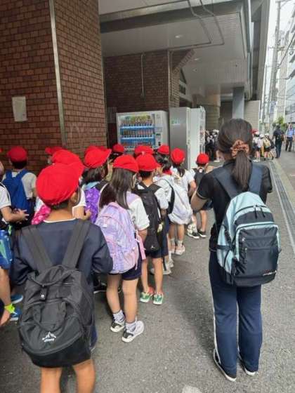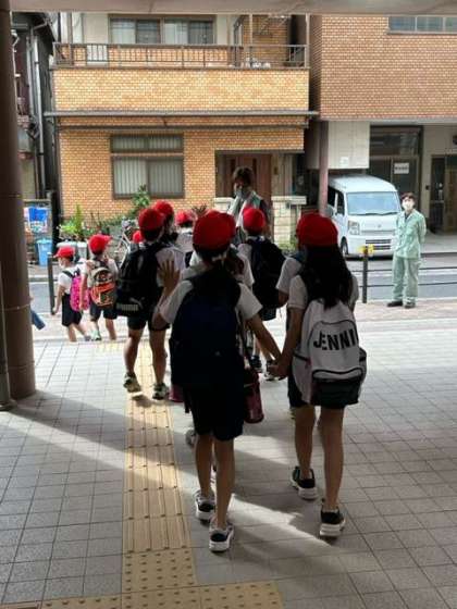 今日は3年生の校外学習です。行き先は、キッズプラザです。駅に向かう道中でも、「おはようございます」と元気な子どもたち。みんなで安全に気をつけて行ってきます。