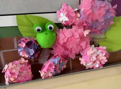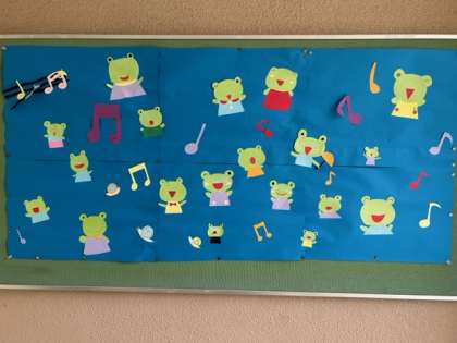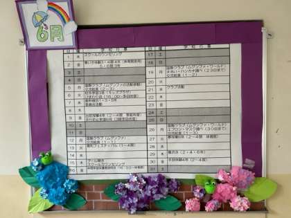 6月になり、雨の日が続いています。そんな雨の日もたのしくなるような掲示物が、育和小学校にはあります。玄関の月中行事予定表、そして掲示委員会の子どもたちがつくってくれた、カエルの合唱の掲示物。「カエルの歌が〜聴こえてくるよ〜・・・」。よく見ると、1匹ずつそれぞれに個性があって、なんとも可愛らしいんですよ。