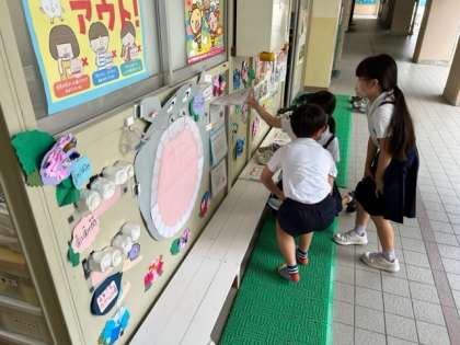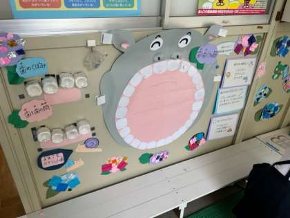 歯科検診のあと、子どもたちが保健室前の掲示物を見て、何やらお話してました。これらの掲示物は、保健室の先生方がつくってくれています。