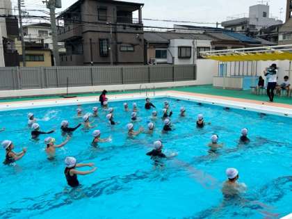 1年生のプール水泳の様子です。回を追うごとに少しずつ、大きなプールにも慣れてきたようです。音楽に合わせて体操したり、水の中で先生の合図に合わせて身体を動かしたり。「水が顔にかかっても、へっちゃらになったよ!」と笑顔で教えに来てくれる子もいました。