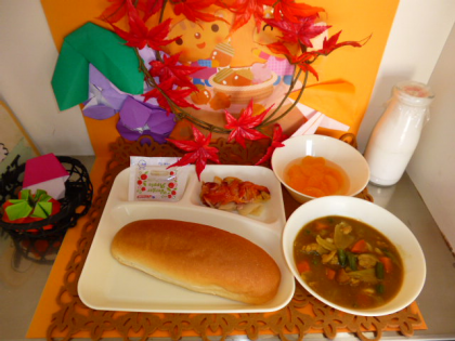 9月30日の給食は、コッペパン・りんごジャム・鶏肉とてぼ豆のカレー煮【米粉】・じゃがいもとトマトの重ね焼き・みかん(かんづめ)・牛乳でした。