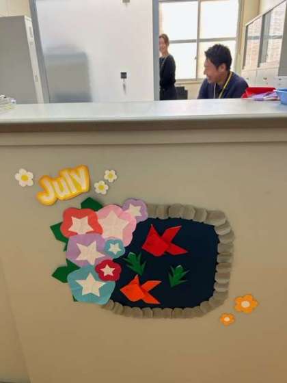 ガラガラ〜っと、ドアを開けると、笑顔の事務職員さんたちが出迎えてくれます。よく見ると、事務室のこんなところに、ステキな折り紙作品が。事務室を訪ねてくださった方々の気持ちが、ちょっとホッコリ和やかになってくださったら、と、「手づくり」してくださったそうです。なるほど、ホッコリしました、そして気持ちが明るくなりました。いつもありがとうございます。