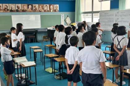 4年生の子どもたちが音楽の時間に歌っています。声を重ねるようにして、先生のピアノに合わせて、高い声も低い声も。遠くのほうで、たくさんの有名な作曲家さんたちもずらりと並んで、育和の子どもたちの様子を眺めてくれているような、そんな感じの音楽室でした。