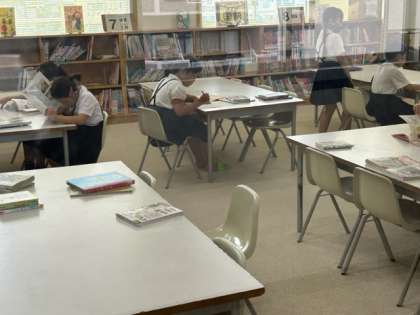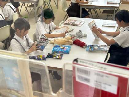 図書室を通ると、子どもたちが本を読んでいました。一人で本に頭をつっこむようにして、読書に没頭している子。読みたい本をずらりと並べて次々に読んでいく様子。大きいサイズの本を前に、横にちょこんと並んで、カーペットに座って読んでいる姿も。
