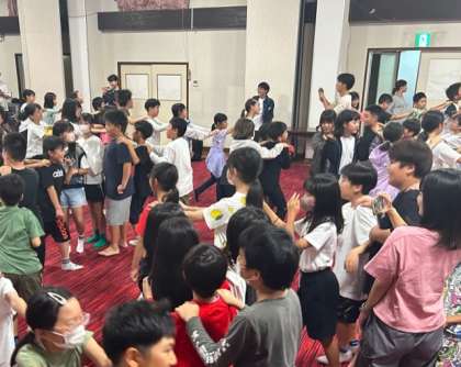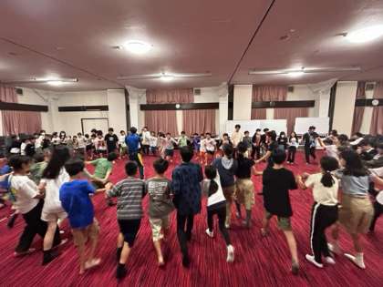 天候とにらめっこの夜の時間でしたが、今夜は大広間で、室内レクをすることにしました。先生方が考えてくれた林間クイズ、チーム対抗じゃんけん列車、そして皆んなで輪になって「マイムマイム」のダンスなどなど、楽しい時間はあっという間に過ぎていきました。