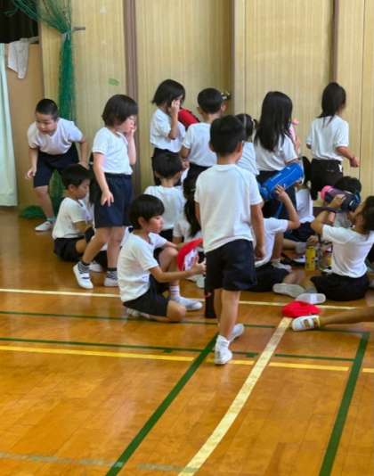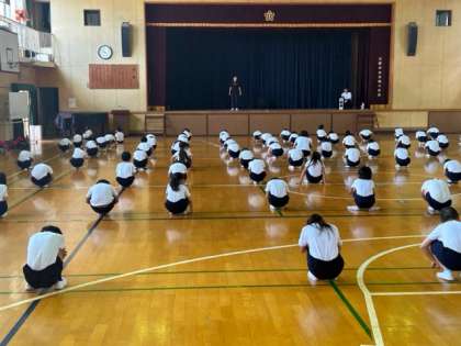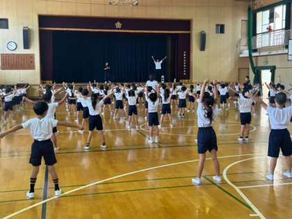 新しい1週間が始まりました。1年生もダンスの練習に励んでいます。土曜日、日曜日と、お休みを挟みましたが、子どもたちはよく内容を覚えていました。「すごいね、練習しんどくなぃ?」「だいじょうぶ!踊るんめちゃ楽しいよ!」「ぼく、家でもやってるねん」こまめに水分補給をして、また自分の列に戻るのも随分スピーディーに。新しい動きもどんどん吸収していく子どもたちです。