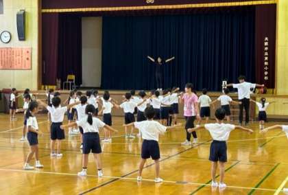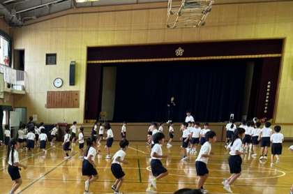 皆んなで前を向いての練習から、今日はクラスごとに円の隊形になって、動きを確認していました。円になったときに、たまたまこれまで通り前を向いている側の子どもたちはへっちゃらですが、後ろ向きや、右向き、左向きになった子たちにとっては、それだけで、もう難しい。これは、中学年、高学年でもなかなか始めは戸惑うものです。そんな練習を、今1年生は行い、少しずつできるようになってきています。がんばってね!