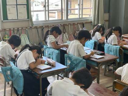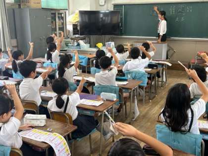 昨日から1名、教育実習生が育和小学校に来ています。昨日は全校朝会で自己紹介、今日はさっそく漢字の学習の場面で、子どもたちの前に立って