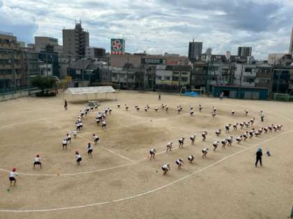 校舎をつなぐ渡り廊下から、運動場の様子がよく見えます。「やぁ〜〜れん、そうらんそうらん・・・」「どっこいしょ〜、どっこいしょ!どっこいしょ〜、どっこいしょ!!」かけ合いの声もそうですが、一人一人の動きに、なかには超躍動している姿も。真ん中に集まってくるところは、皆んなな力強さが集まってくる、そんな感じがあります。