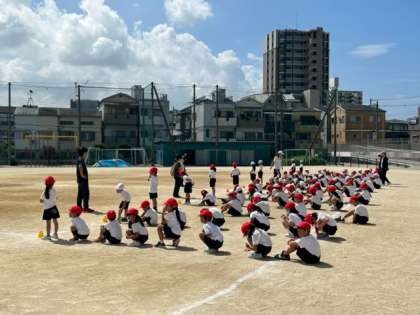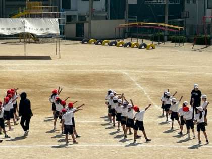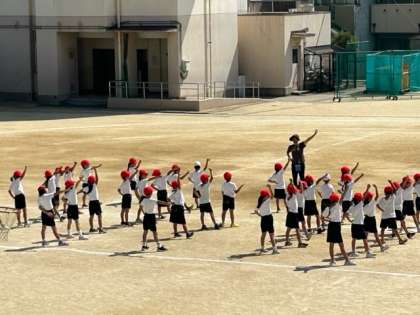 運動場では、1年生が自分の位置を確認しながら、練習を進めていました。体育館でやっているときとは広さも違うので、なかなかたいへんですが、子どもたちはがんばっています。