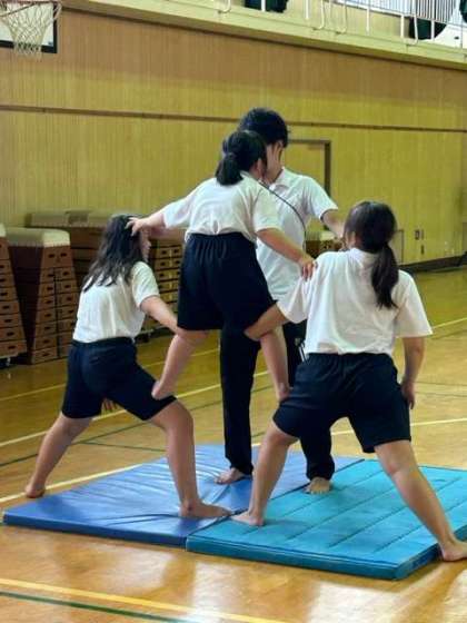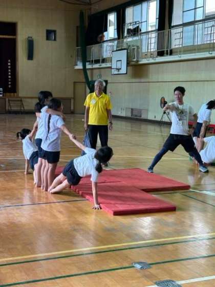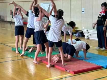放課後の体育館。6年生が自主的に残って練習しています。「そうそう、その調子!」1人よりも2人、2人よりも3人で。みんなで技ができたときには、先生も一緒になって喜び合っていました。