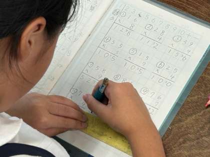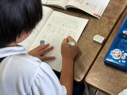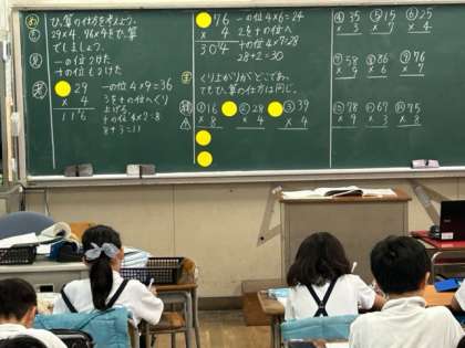 3年生です。今日はかけざんの筆算の学習でした。時間の終わりの方に覗いてみると、今日学習したことをもとに、ノートに書いて計算練習をしていました。そのノートの丁寧さ。スペースも充分とって、自分が後から見ても見やすいノートづくりができていますね。