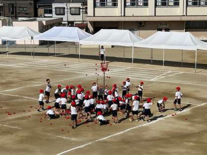 いよいよ運動会まであと1日になった金曜日。各学年が運動場を順番に使って、最終練習の時間を取りました。1年生の玉入れ。でも、ただの玉入れではありません。「投げる」と「投げる」の間にかわいい秘密が・・・。当日を楽しみにしていてくださいね。