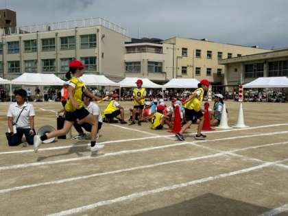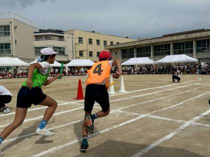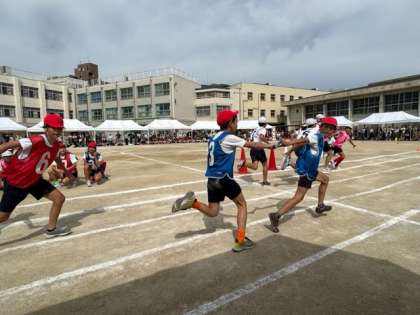 6年生「繋ぐ!140周年のバトン!」です。やはり6年生の「走競技」はスピードが違います。1年生の前を颯爽と走り抜ける姿に、「すごーい」と、拍手と声援を送っていました。なかには、ゴール直前までどちらが勝つかわからないほどの接戦もありました。負けたチームが、笑顔で拍手を送る姿も印象的でした。