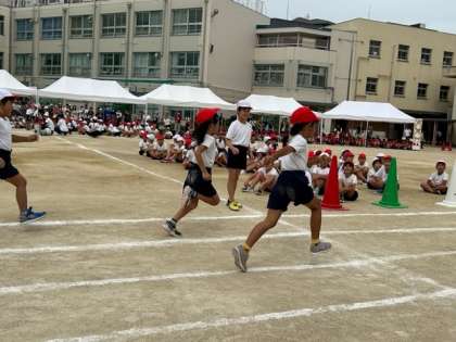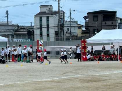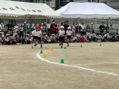 2年生「Let2☆GO」です。スタートしてしばらく行くと大きなカーブに差し掛かります。膨らみすぎないようにコーナーを向かって、ゴールに向かって一直線。にこにこしながらゴールする様子、真剣なまなざし…最後までよくがんばりましたね。
