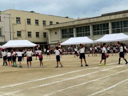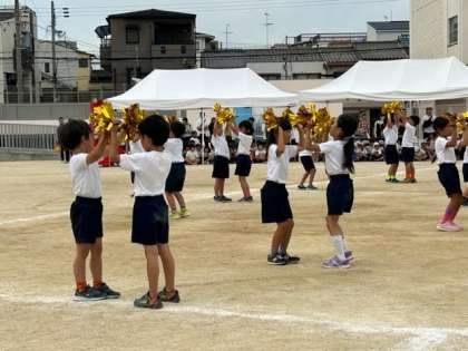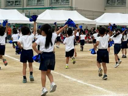 1年生「みんなにサチアレ!」です。キラキラ輝くポンポンを手に、1年生が元気いっぱい踊りました。2年生〜6年生皆が見守るなか、観ているこちらが幸せになるような気持ちになれる、そんなダンスでした。小学校生活初めての運動会、よくがんばりましたね。