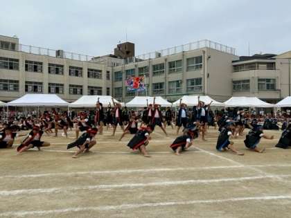 6年生「Departure、出発の時〜140th」です。いよいよ最後のプログラム。6年生の登場です。演技は組体操とソーランの2部構成。それぞれに力強さと一体感があり、観ている人の心を引き付けていきました。特に技や動き決まった時の低学年や中学年からの「おぉ〜」「すごい!」「かっこいい」の声が子どもたちを励ましていたようです。最後はグループごとに感謝や近いの言葉とポーズ。最後まで心あたたかな拍手をありがとうございました。