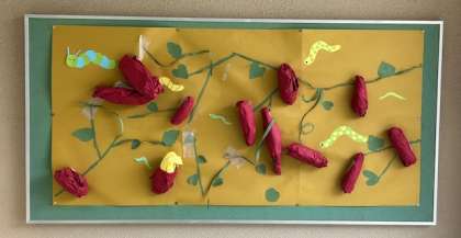 子どもたちがつくった、秋の掲示物。大きなさつまいもが実りました。ちょっと大きめなので、時々ポトリと落ちちゃうときもありますが、しばらくすると、ちゃんと誰かが復活させてくれています。皆さんはこの秋、サツマイモを食べましたか。