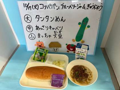 タンタンめん あっさりキャベツ まっちゃ大豆 コッペパン ブルーベリージャム、ぎゅうにゅう です。