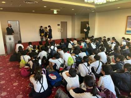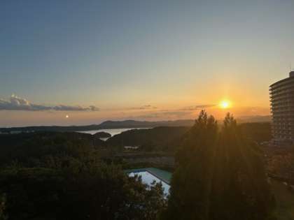 夕陽が沈む素敵な景色が観える広間で、係の子どもたちの司会のもと、開舎式を行いました。代表で挨拶してくれたあいさつの言葉。気持ちを込めて、しっかりお伝えできましたね。また、一泊二日お世話になるスタッフの方からも、あたたかなお声がけをいただきました。