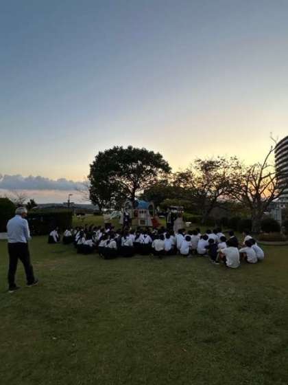 万が一の時に備えて、避難訓練を行いました。学校とは勝手が違うので、よく聞いて、よく覚えてくださいね。