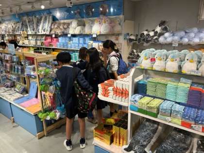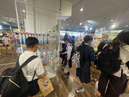 「さあ、そろそろおみやげ考えよ〜っと」「先生これ見て!クッキー28枚も入ってて、しかも540円!めちゃいいやろ〜」とおススメのお土産を教えてくれました。一方、「いいなぁ、でも残額が・・・」という子も。「でも大丈夫、もうちょい安いのもあるよ〜」と、周りの友だちが一緒に考えてあげている場面もありました。